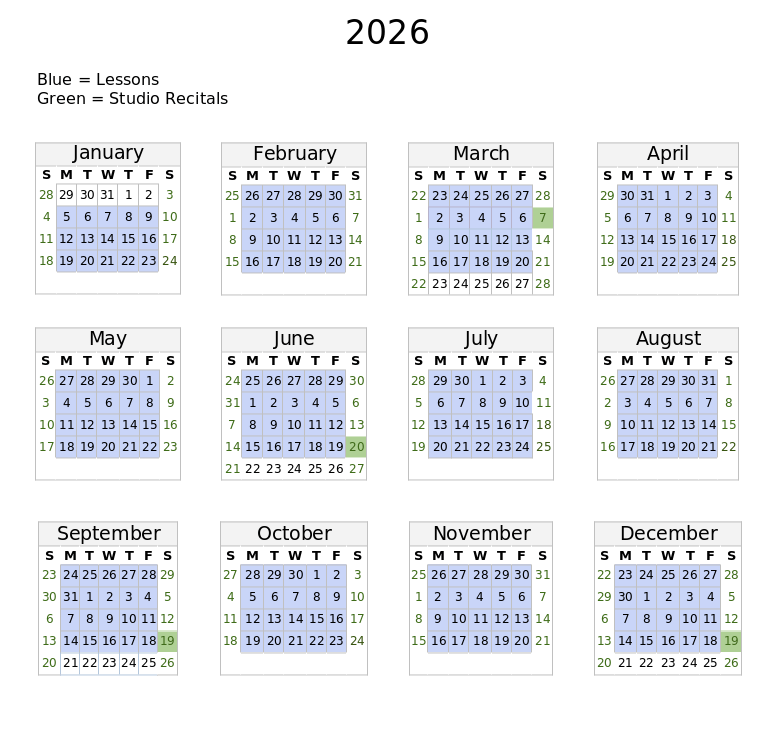 Winter Break: there will be no lessons between Dec 20th, 2026 and January 3rd, 2027. The monthly tuition rate during that time will remain the same.